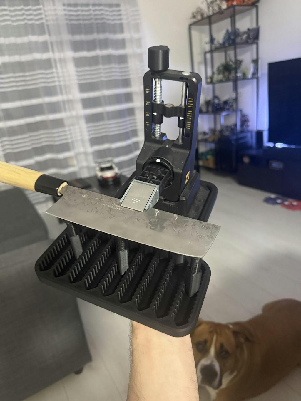 Designed for stability and accessibility, this platform eliminates the need to hold the Work Sharp base with one hand while sharpening with the other. It includes three adjustable knife supports that lock firmly into position, each with height control to support short, long, thin, or tall blades. The slots are spaced 5 mm apart, offering 126 support placements for precise fit and full blade control.